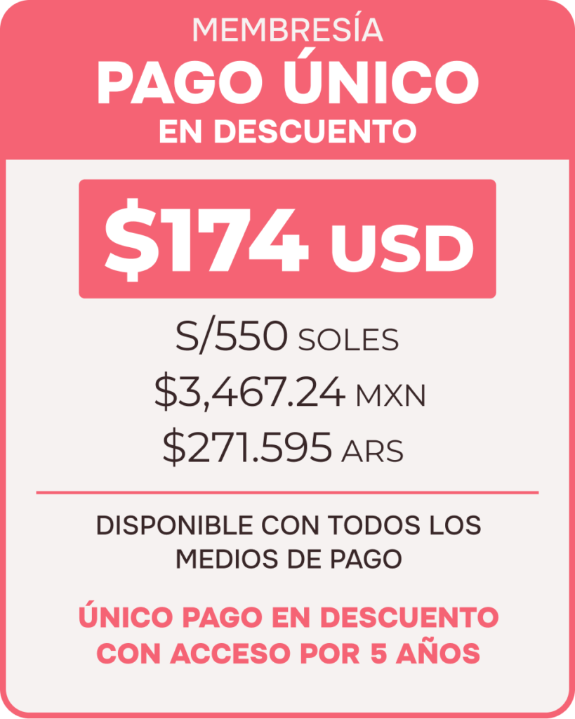 Si eres uno de ellos y te interesa mucho, únete hoy mismo. Te comento también que brindo una facilidad de pago de $19 DÓLARES o S/60 SOLES al mes, es realmente una súper oportunidad de inscripción mensual que al finalizar las 12 cuotas , tienes acceso de por vida al contenido y actualizaciones,. Pronto su valor mensual será de $27 USD. No lo dejes pasar hoy.